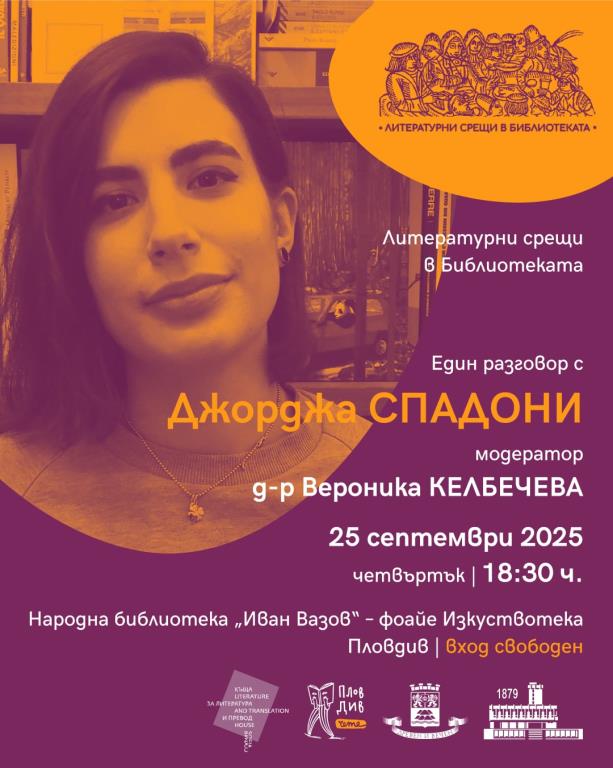 Литературни срещи в Библиотеката – 25 септември, 18:30 ч., НБ „Иван Вазов“. Среща с италианската преводачка Джорджа Спадони, която ще разкаже за пътя на българската литература до Италия.