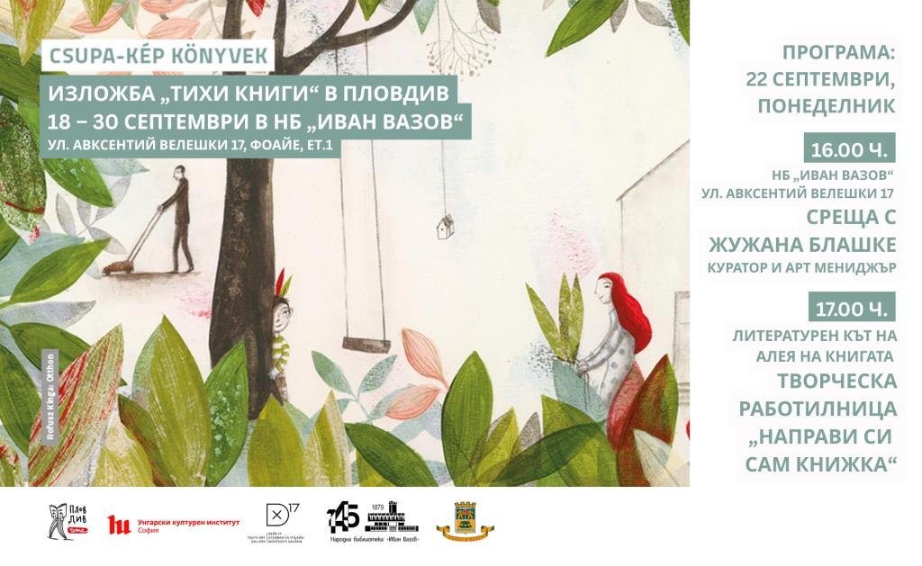 Изложба „Тихи книги“ – 18–30 септември в Народна библиотека „Иван Вазов“. На 22 септември от 16:00 ч. се предвижда среща с унгарката Жужана Блашке и съвместно разглеждане на изложбата съвместно с Унгарски културен институт "Лист", а от 17 ч. на Литературен кът към Алея на книгата в работилница за деца могат те да изработят своя тиха книга.