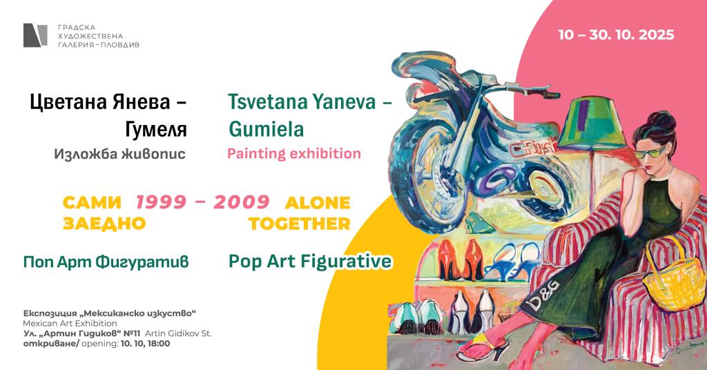 Известната художничка Цветана Янева-Гумеля, която дели времето си между Пловдив и Берлин, ще представи 30 свои живописни творби, създавани по различно време, но обединени от поп арт фигуратива като стилово направление и от общото послание в селекцията. Изложбата й "Сами заедно 1999 – 2009" ще се открие на 10 октомври (петък) в 18:00 часа в сутеренната зала на Постоянна експозиция "Мексиканско изкуство" към Градска художествена галерия – Пловдив (ул. Артин Гидиков №11, Стария град). Ще може да се види до 30 октомври.