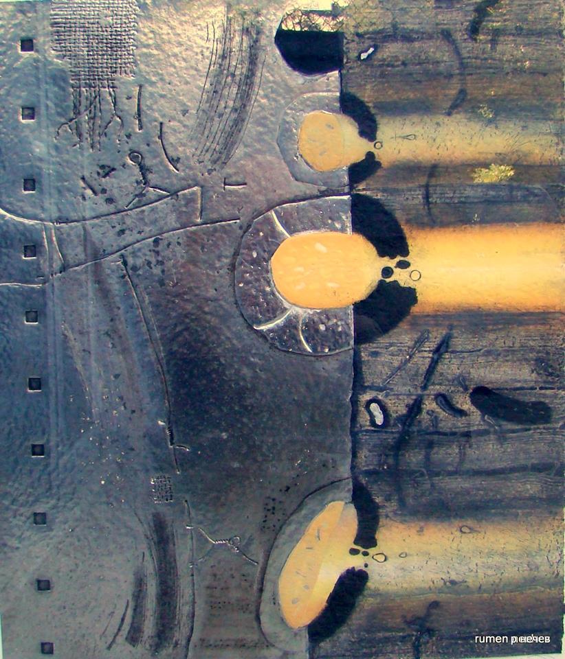 Този елемент въздейства чрез спецификите на триизмерната форма, чрез обем, цвят, фактура, чрез ритъма и динамиката на рисунъка по него и кореспондира активно в съседство с дълбокопечатните зони. В тях монохромната среда на пространствените планове е приютила множество пластове, в които съществуват различни скрити детайли - орнамент, стилизирана форма на цвете, някакви неразпознаваеми отломки, геометрична форма. Решени с по-активен цвят или линеарно, тези конкретни елементи представляват поантата на този сложен, илюзорно абстрактен фрагмент материя и пространство.