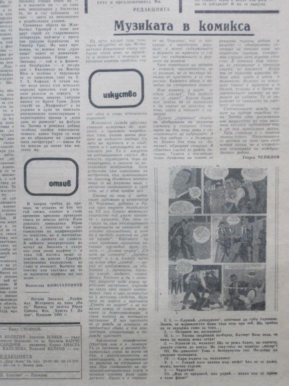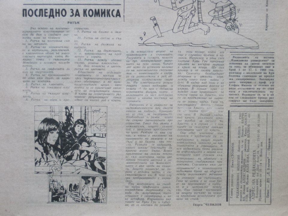В периода 1987–1989 г., в гр. Пловдив, в условията на идеологически ограничения и липса на институционална и професионална рамка, са публикувани поредица от статии, посветени на теорията, естетиката и езика на Деветото изкуство – комикса. Тези публикации са дело на Георги Чепилев и излизат във вестник „Комсомолска искра“ и " Пловдивски университетски вестник" под редакцията на Емил Стоянов. Те представляват първия системен български опит за философско, естетическо и семиотично осмисляне на комикса като самостоятелна художествена форма.