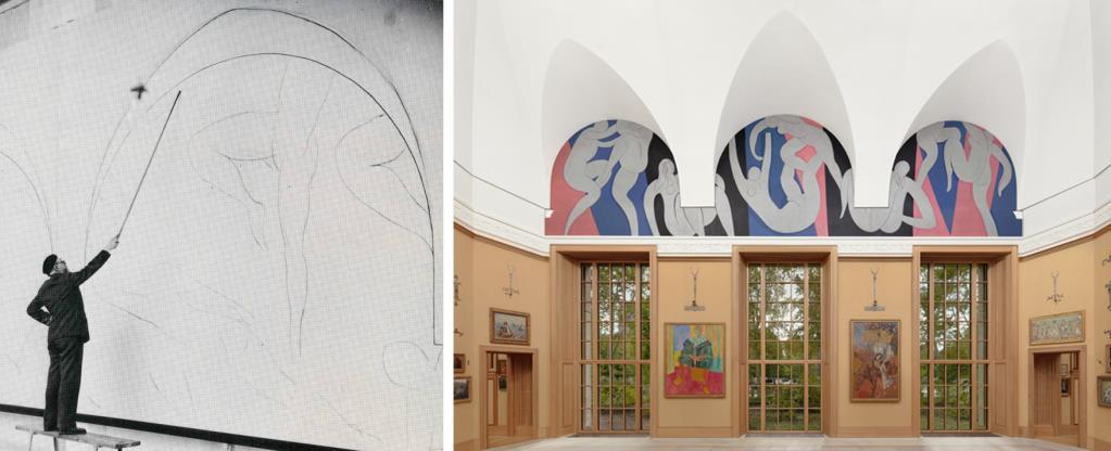 Архитектурният вкус на Барнс изисквал стенописно оформление на три люнета във вътрешната част по трите свода. Площта от 52 квадратни метра възлага на Анри Матис. Художникът предложил темата „Танц”, тъй като бил изпълнил две картини с голям размер за московския колекционер Сергей Щукин. На едната от тях е изобразен хоровод, който фигурира в задния план на картината „Радостта на живота”. Това е сякаш танц между небето и земята. Аполинер казва за творбата: "Танц и спорт са живот и ритъм. Танцът и Музиката са повлияни от следните източници: сардана (каталунски танц), от картините на Тулуз Лотрек - шумната фарандола, опитите за телесно освобождение на Айсидор Дънкън, таитянския символизъм на Гоген, нудистките къпещи се на Сезан."